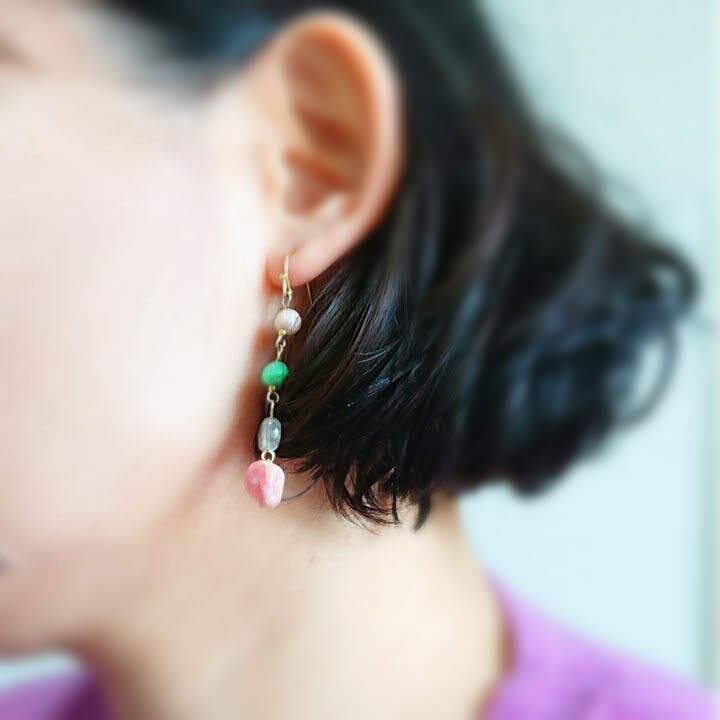 アンシンメトリーに違った天然石が揺れるピンクミックスピアス