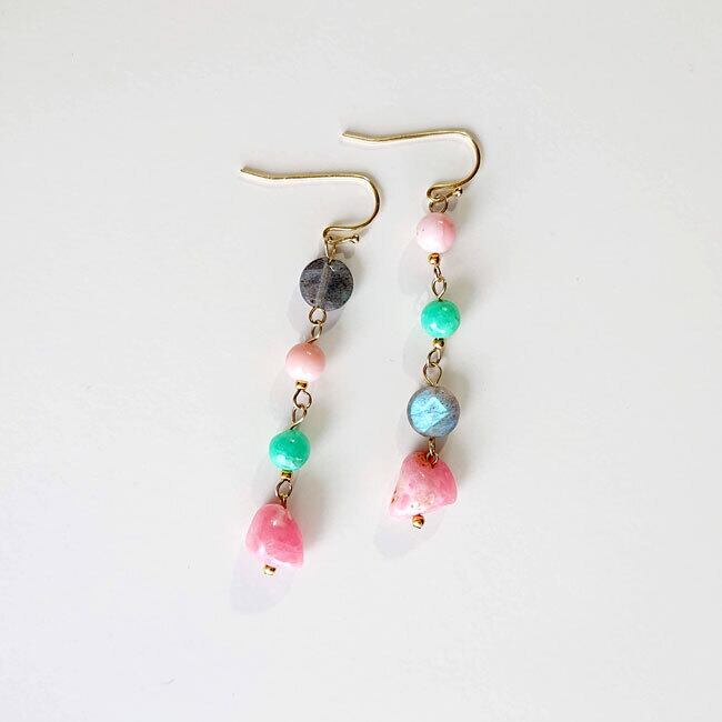 ピンクオパール、そしてインカローズのピンクにラブラドライト、アクセントに明るいグリーンのクリソプレイズをランダムに組み合わせたピアス。