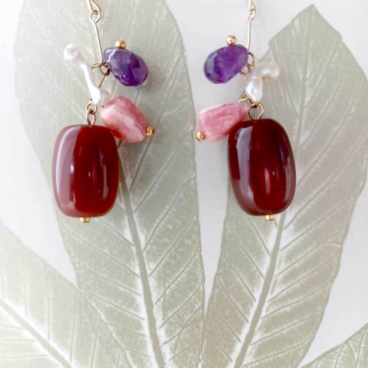 存在感のあるメノウからインカローズ、ケシパール、アメジストへといびつなリズム感のジグザグピアス。
