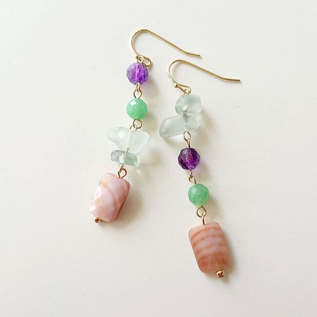 ピンクとグリーンのアベンチュリン、そしてアメジストをランダムに組み合わせたピアス。