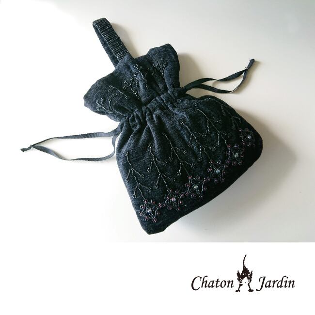 両面にお花のモチーフがビーズ刺繍された巾着バッグです。